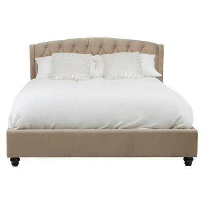 The Josephine Mink King Bed boasts a lofty, curved headboard adorned with a diamond-patterned tufted design that adds a stunning visual element and offers excellent back support. Complementing the luxurious cushioning is the addition of metallic button detailing, adding to the bed's refined aesthetic. Crafted from renewable pine wood, the frame provides durability, while the black-finished orb feet ensure stability above the ground.