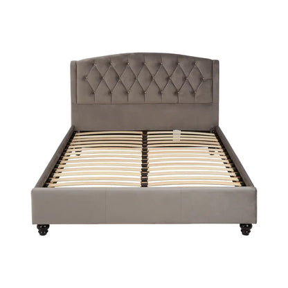 This luxurious bed's curved headboard is covered in luxurious, soft steel velvet and adorned with diamond-shaped tufting. The addition of a stud detailing, in contrast to the muted shade, elevates the design to one of refined elegance and sophistication.