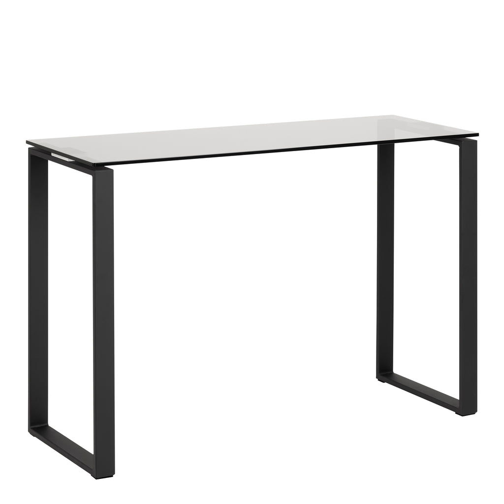 Introducing a sleek addition to your decor with this console table, featuring a smoked tempered glass top and a matte black steel sledge base. Its robust design and modern appeal make it a versatile piece for any room, without the bulk.