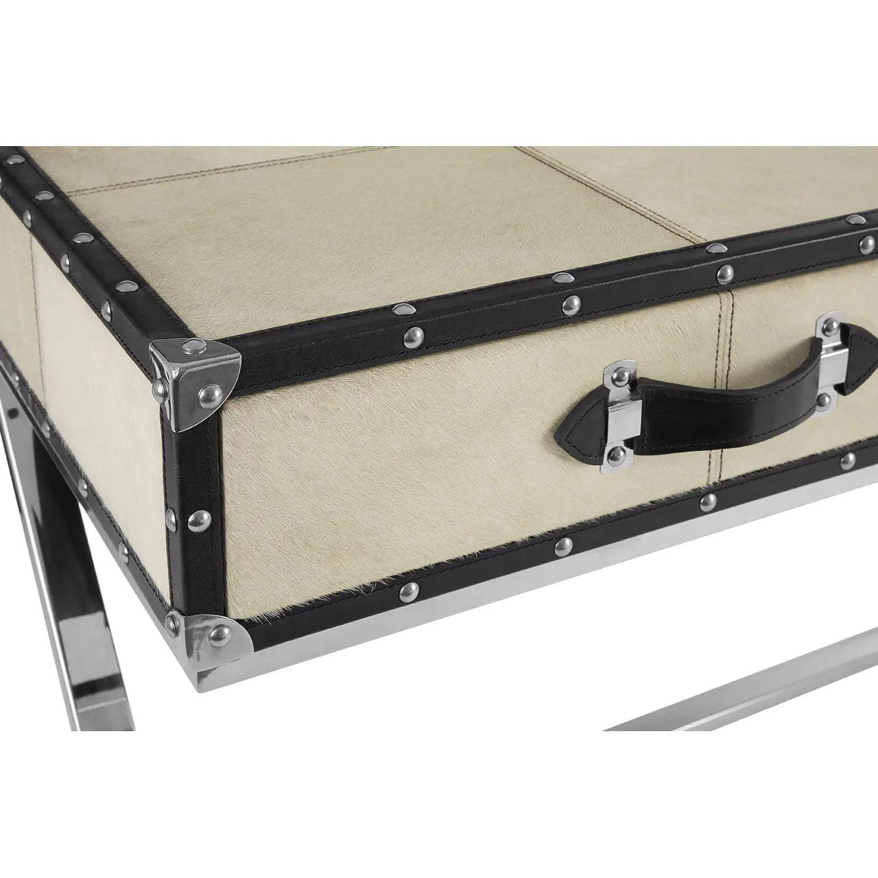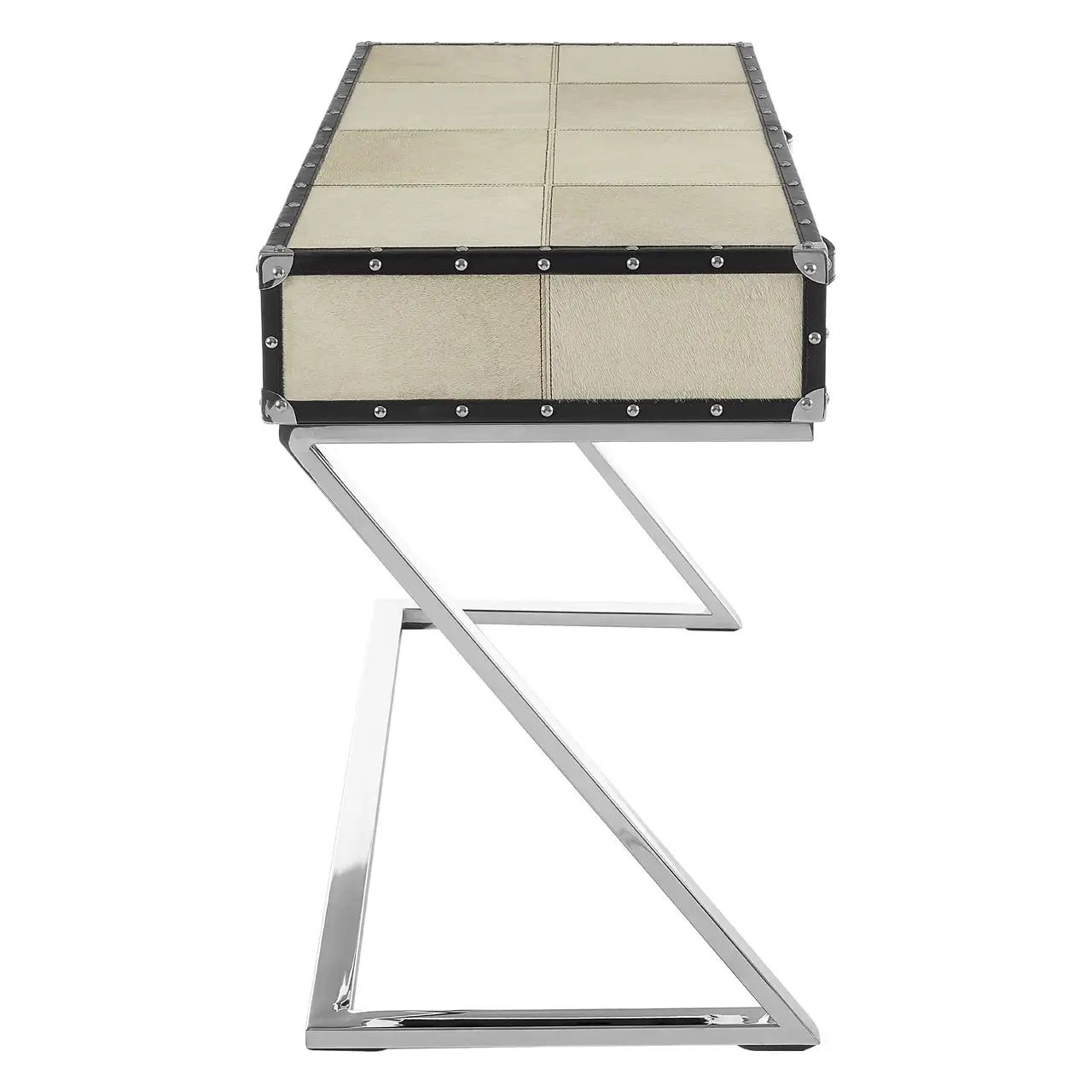 The frame of this exquisite console table is crafted from sustainable mango wood. Contrasting the light hue of the leather, black leather strips adorn the sides, accented by elegant stitching. The top section features a striking grid pattern. Both drawers are equipped with luxurious leather strap handles, adorned with stud details that beautifully complement the polished stainless steel Z-shaped legs.