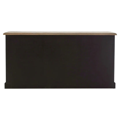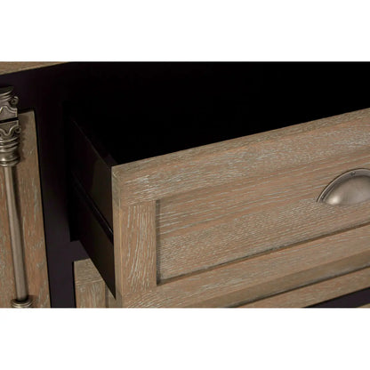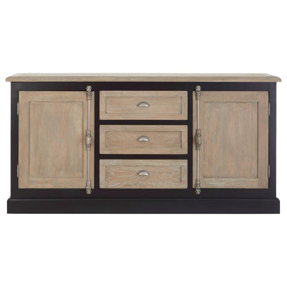 Elevate your dining room with the opulent Kensington Townhouse sideboard. Impeccably crafted, this piece boasts three central drawers and two side cupboards, adorned with ornate metal handles and pull bars. The oak grain is intricately flecked with hints of silver, adding to the luxurious aesthetic. Plus, the oak wood veneer in the middle section ensures long-lasting durability.