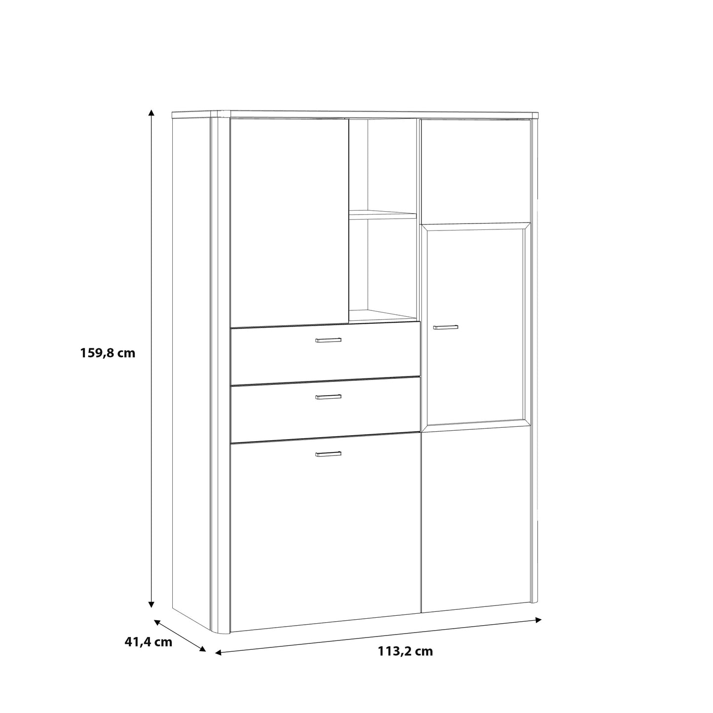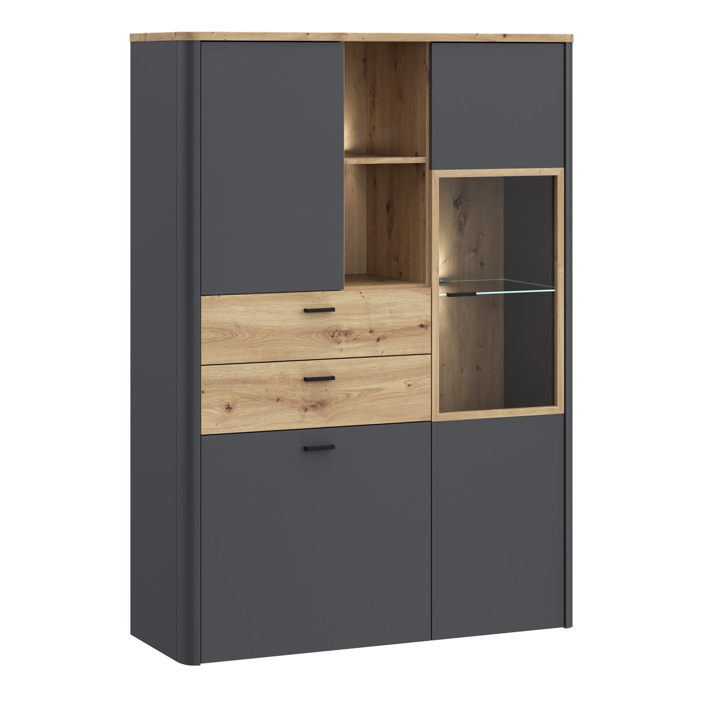 Enhance your home with the Klara Display Cabinet in Grey and Oak. Modern design, Artisan Oak/Uni Wolfram Grey finish, and convenient soft-closing hinges for ease of use. LED lights included for extra Style.