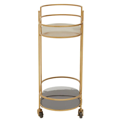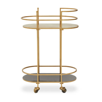 The luxurious matte gold finish of the Korba trolley makes a sophisticated statement in any living area. This elegant trolley features a slender metal frame with clean lines, supported by castors, and boasts storage shelves coated in a tasteful grey enamel, perfect for serving and organizing.