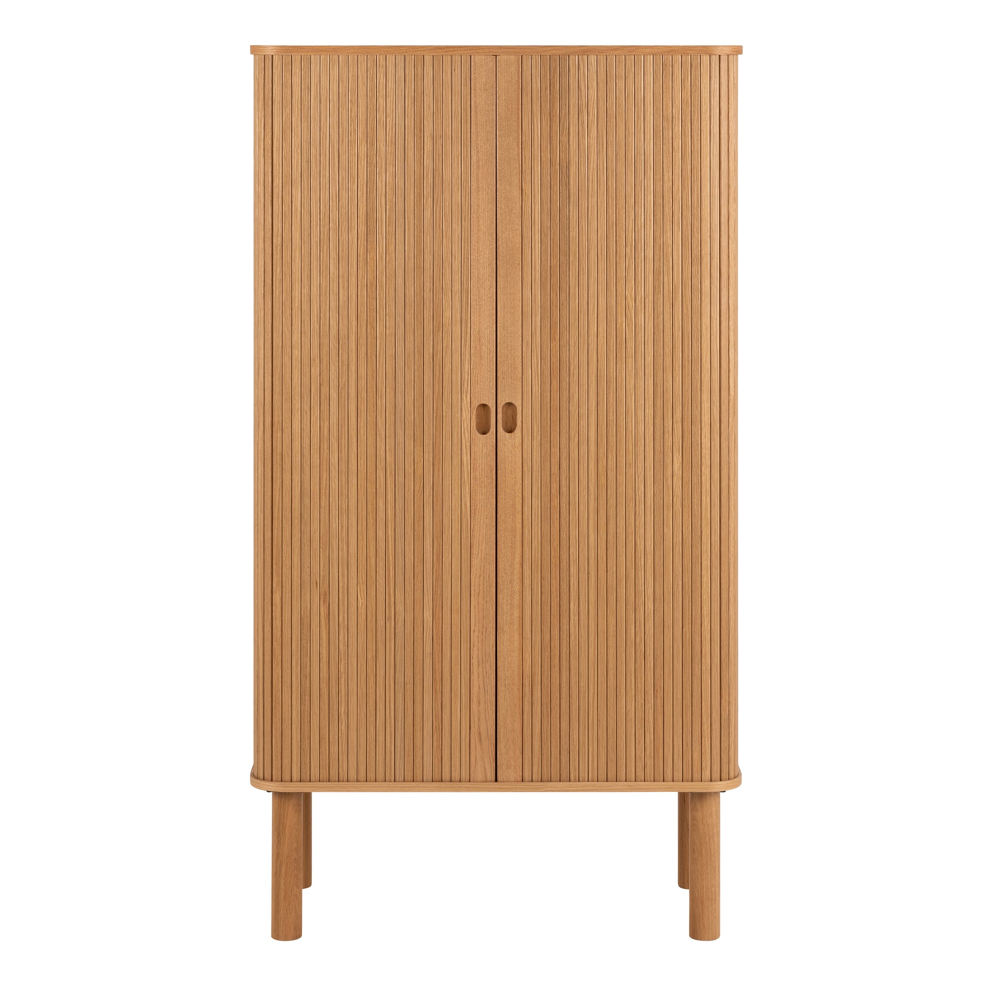 Revitalize your interior with this sophisticated cabinet, boasting a sleek oak veneer finish and innovative storage solutions like a lamella design, sliding door, and tambour door. The design is completed with a sturdy base and two internal shelves for organization.