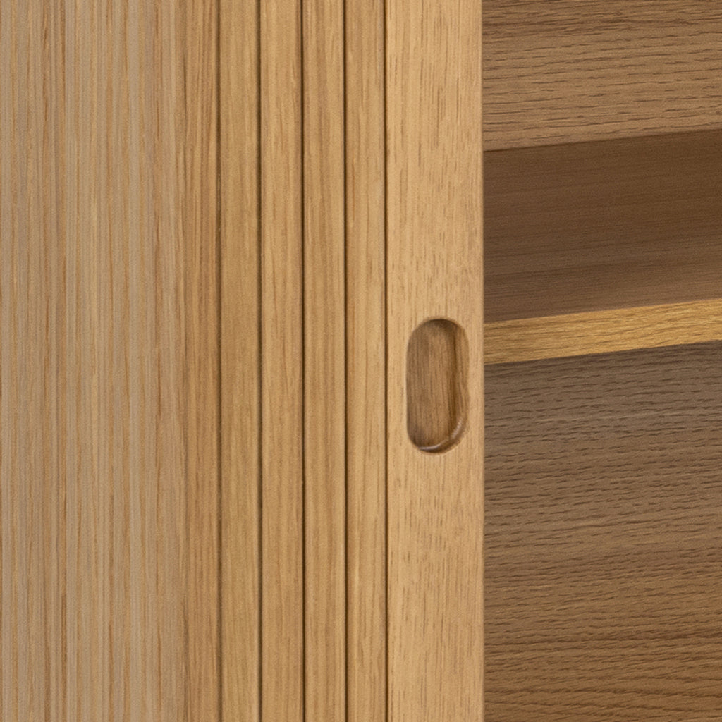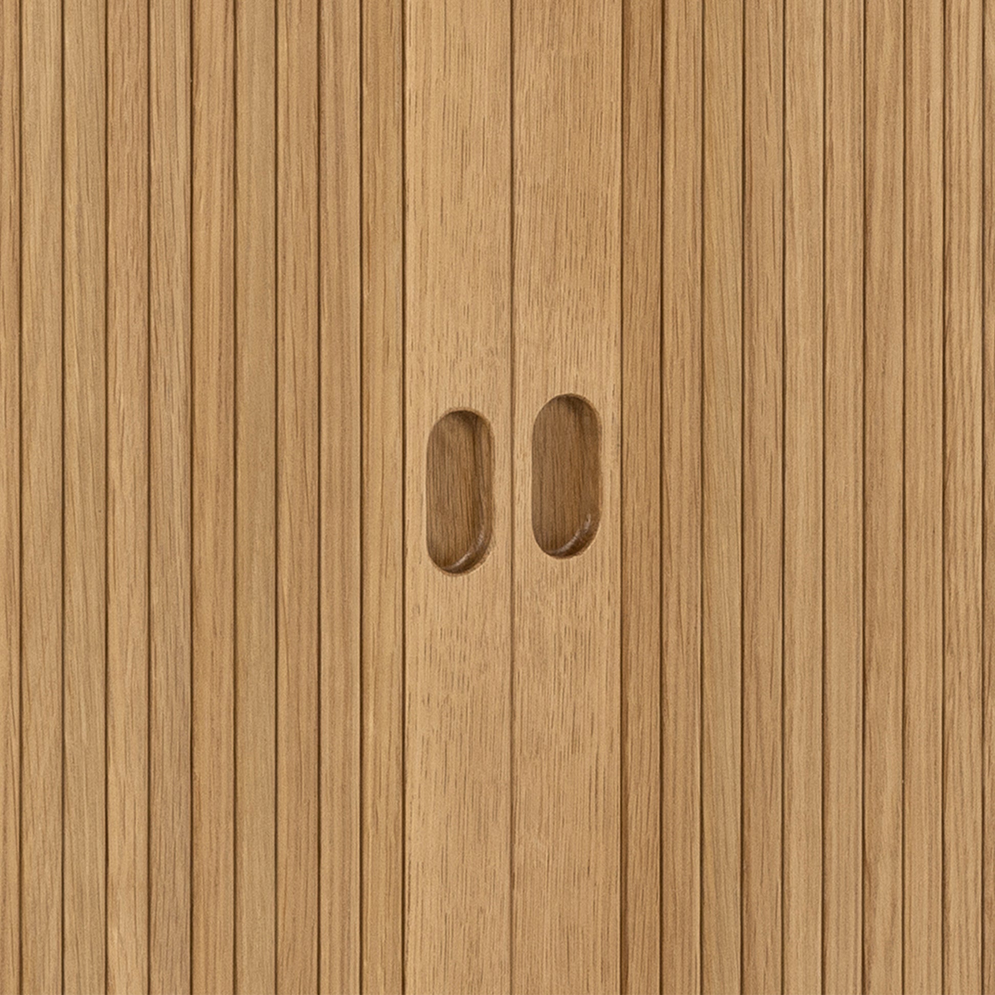 Enhance your space with our elegantly designed sideboard, featuring a sleek oak effect finish, innovative sliding and tambour doors, and ample storage with two sturdy shelves. Its sophisticated lamella design complements any decor, offering both functionality and a touch of modernity.