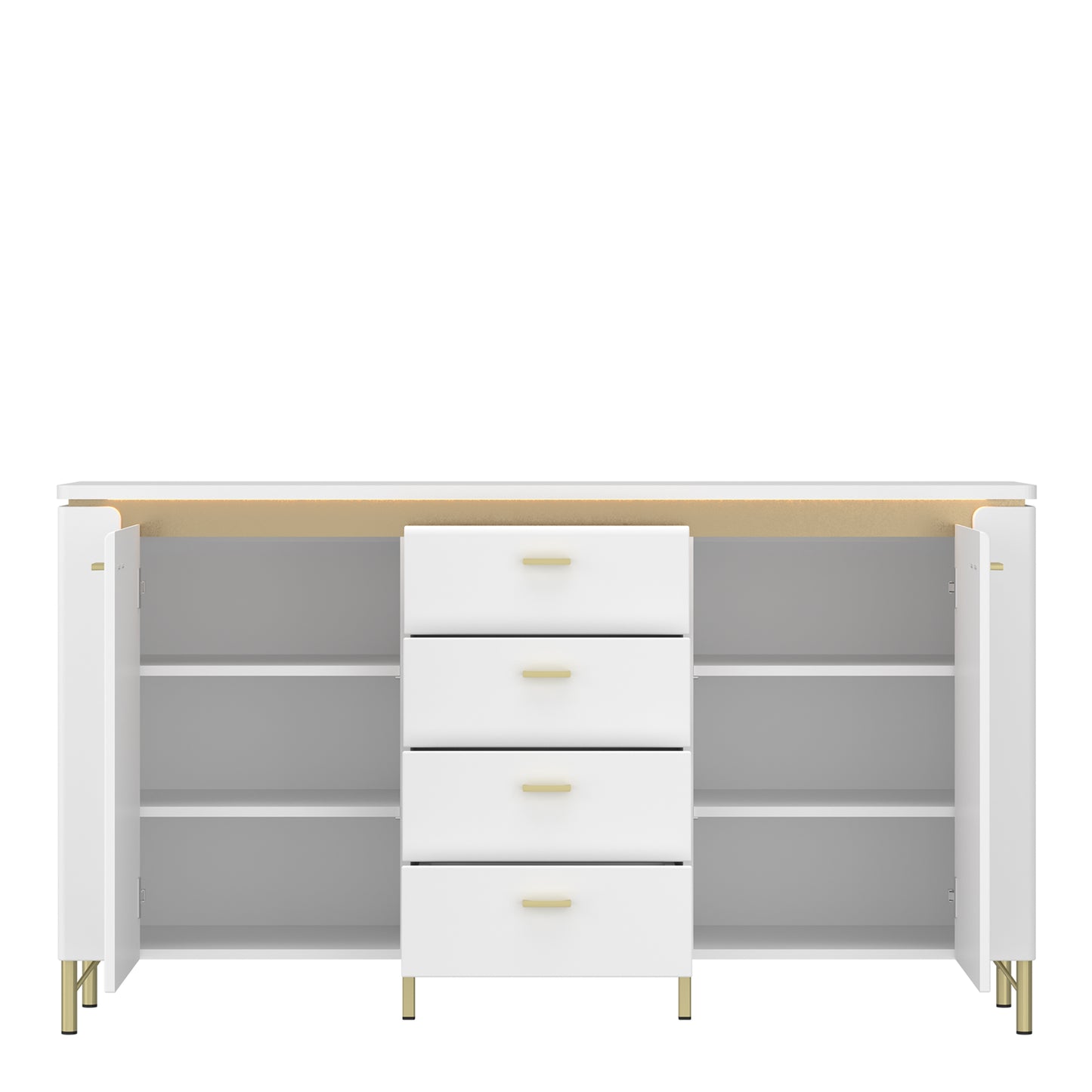The Lazio 2 Door 4 Drawer Sideboard combines modern elegance with practical storage. A high gloss white finish, gold accents, and LED lighting make it a standout piece.
