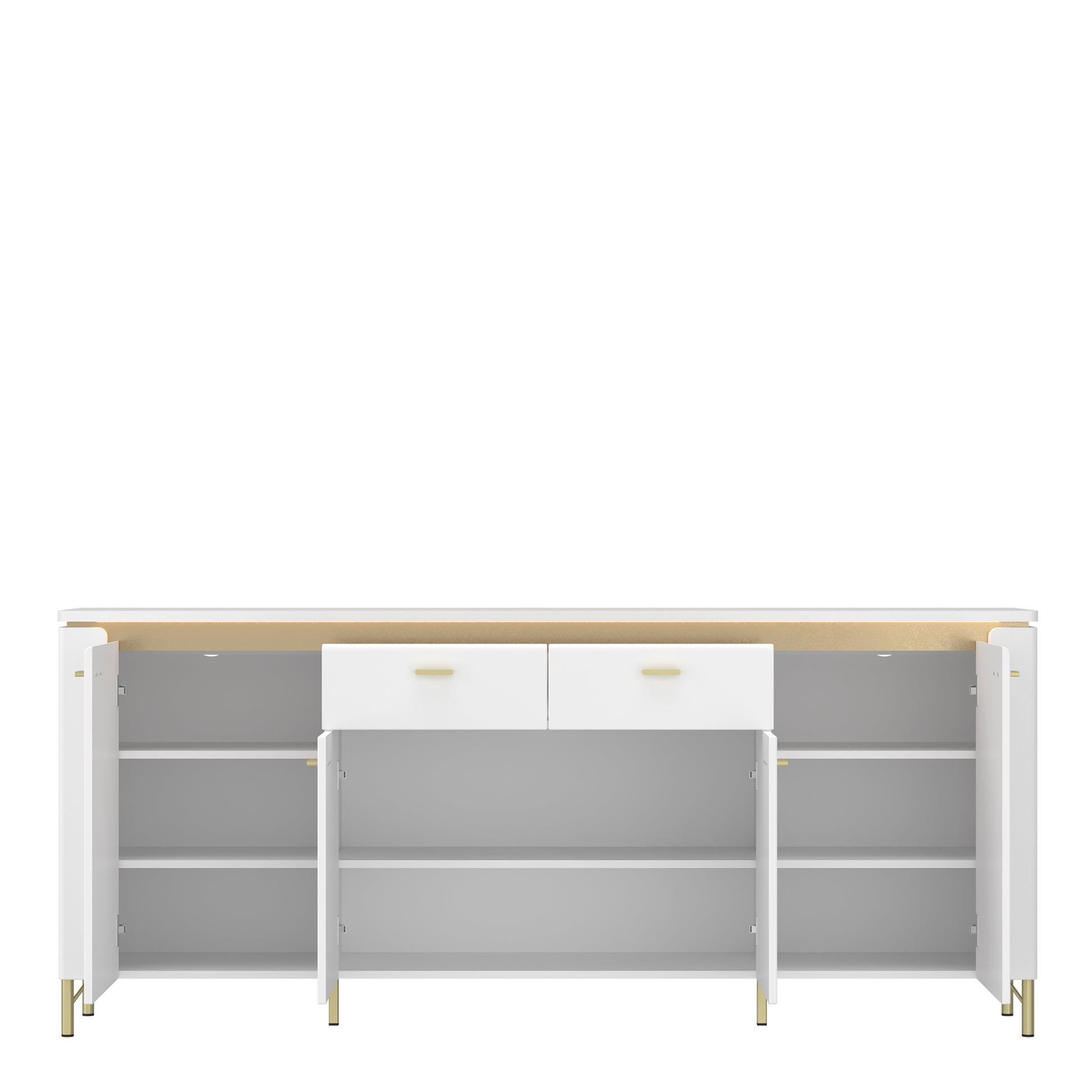 The Lazio 4 Door 2 Drawer Sideboard combines style and function with a high gloss finish, gold accents, and LED lighting. Perfect for chic, modern, or glamorous interiors.