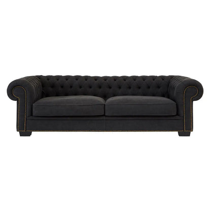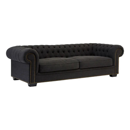Embodying space for three individuals, this sofa flaunts plush cushions and a sturdy, supportive backrest. A deep, charcoal textured fabric envelopes the piece, serving as a luxurious backdrop for the intricate design of warm metallic studs.