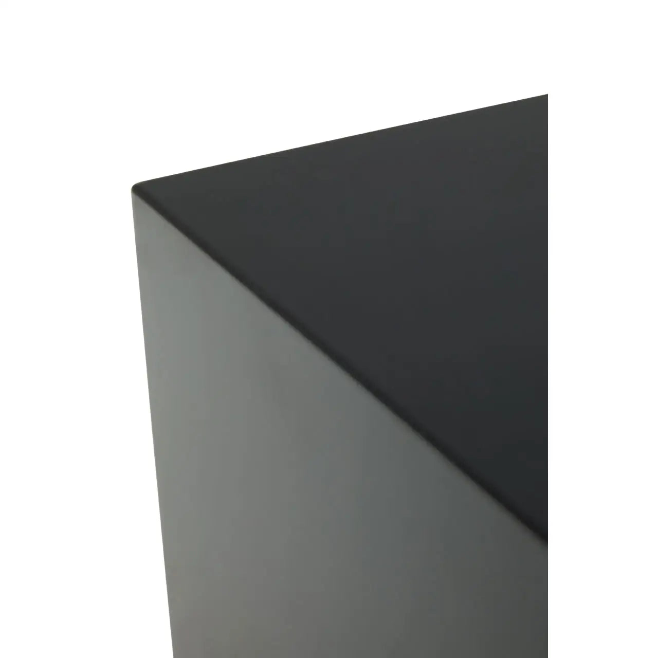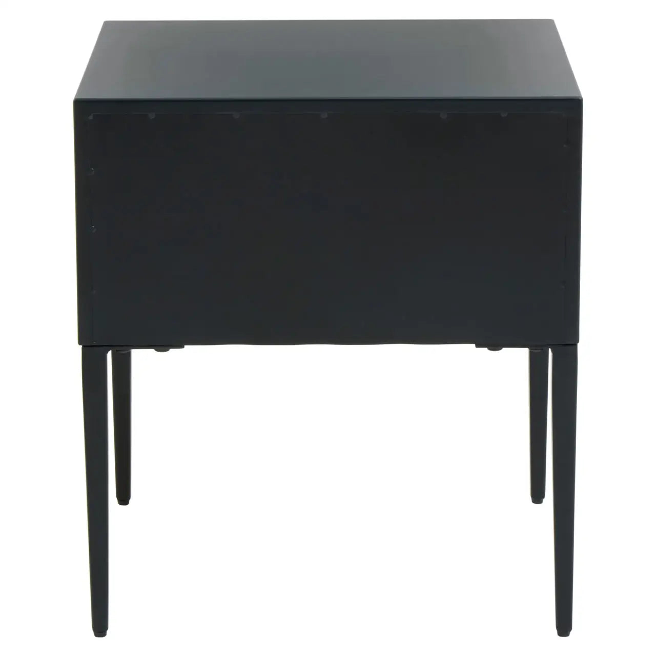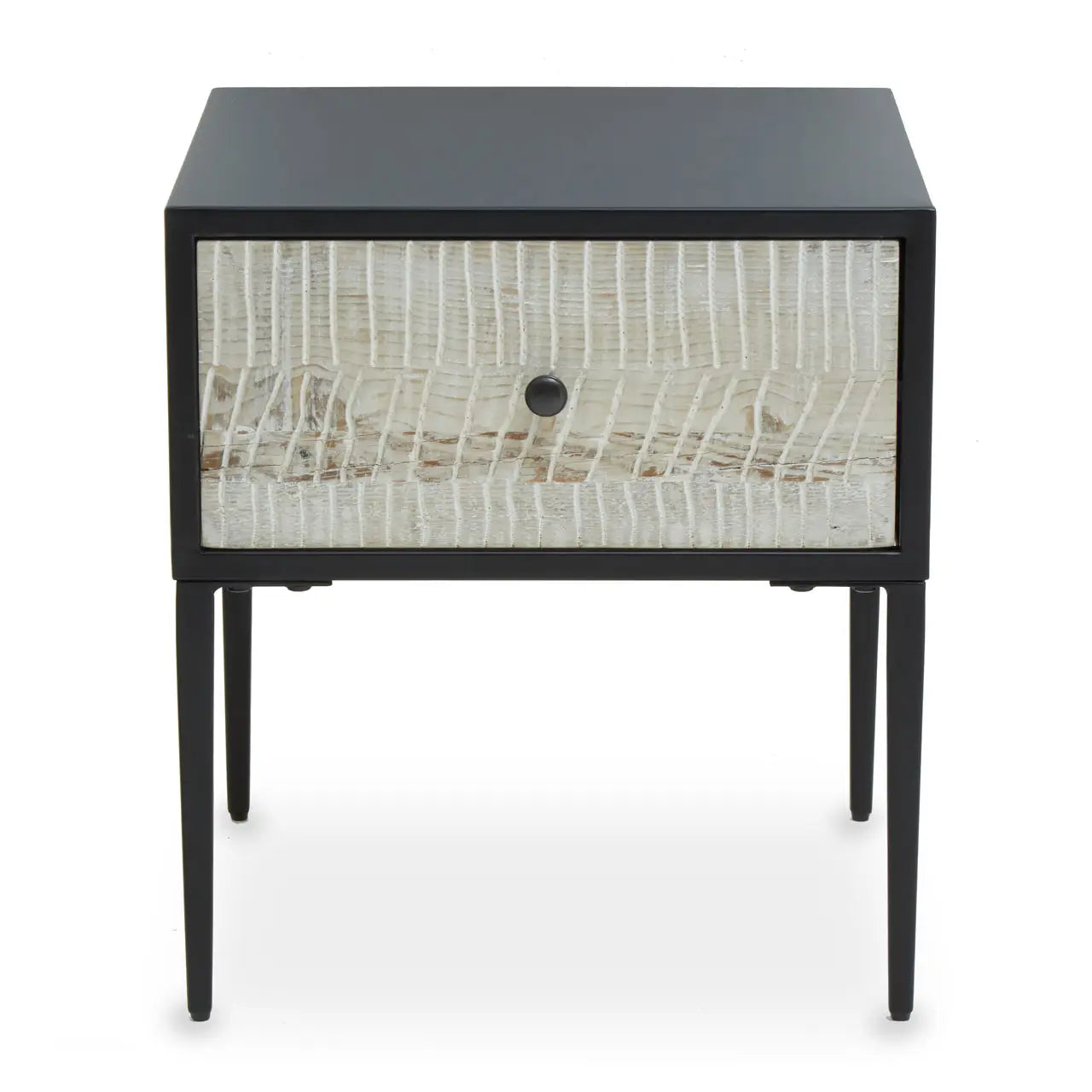 This luxuriously designed side table offers both storage and display space with its single drawer and carved geometric detailing. The slender iron legs, coated in sleek black powder, provide a refined touch that seamlessly complements subtly-industrial homes.