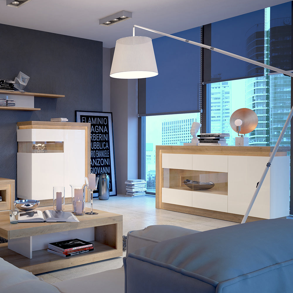 Designer coffee table in Riviera Oak/White High Gloss. Fantastic geometric designed coffee table, storage all round on shelving. A high quality collection in a ultra modern design - with each item complementing each other.