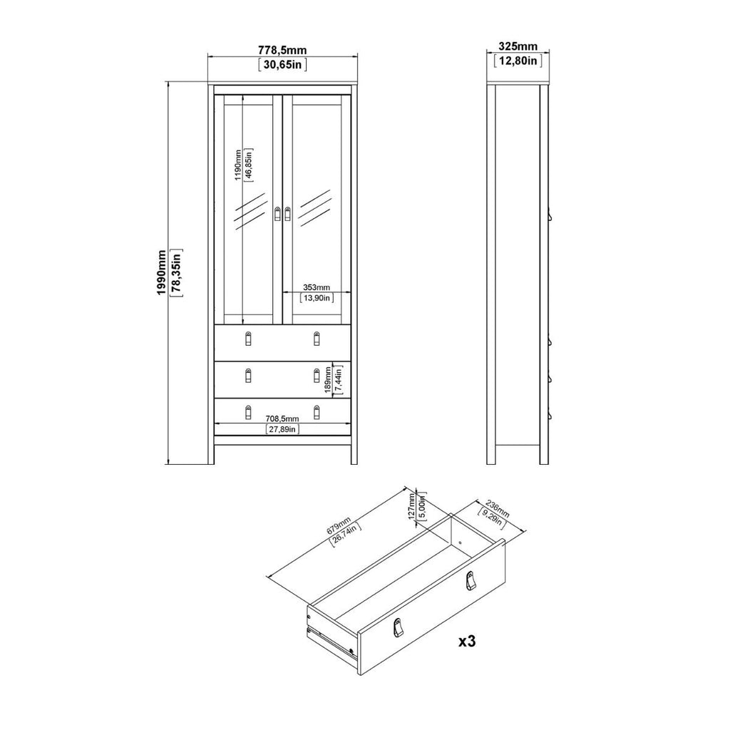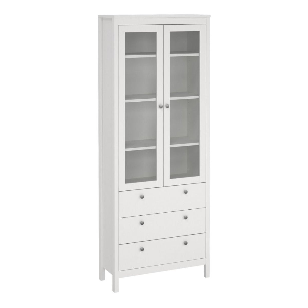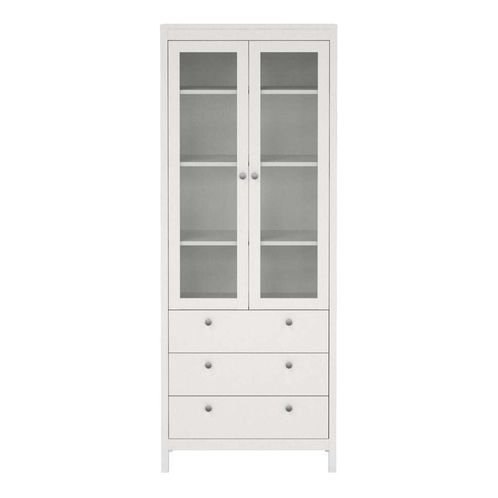 A contemporary glass display cabinet with two doors and three drawers in an elegant design complete with a simple metal handle, also available in contrasting matt black