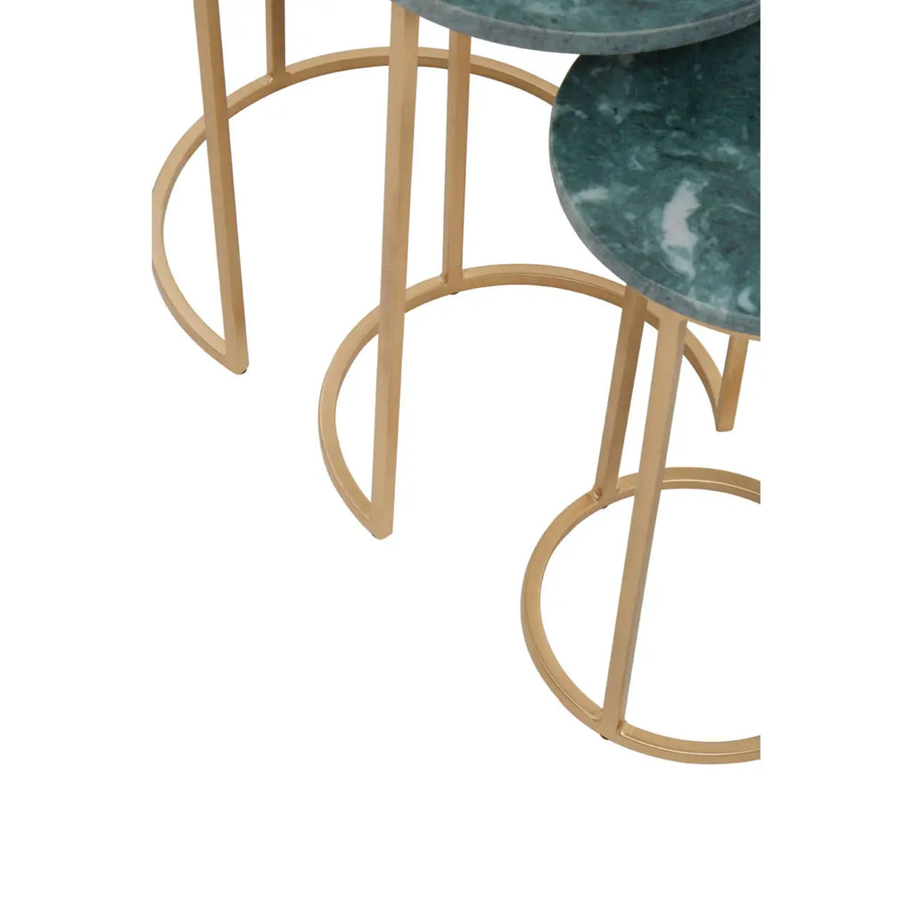 Experience the exceptional addition of this nest of three side tables to elevate any transitional or modern design. The tables boast round green marble tops, complemented by elegant gold powder coated iron frames, ensuring both style and durability.