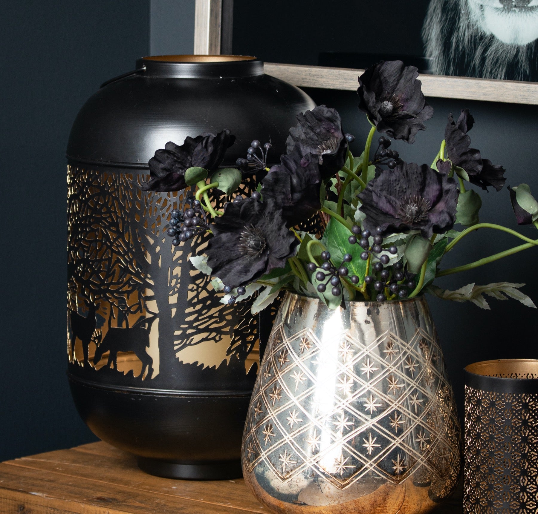 This is the Medium Glowray Christmas Dome Forest Lantern. A stunning lantern with a metallic interior which shows its intricate cutwork pattern off beautifully. A perfect addition to add atmosphere and warmth to interiors and perfectly inkeeping with the trend towards darker interiors. This lantern will look lovely alone or in combination with an array of others in the same finish. Add one of our real wax LED candles (sold separately) to finish the loo