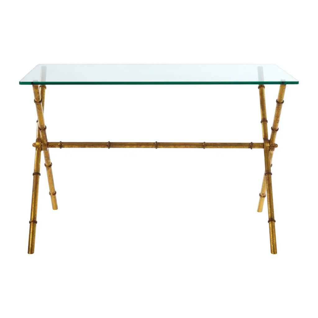 Experience boho luxury in your hallway or living room with the Monroe console table. The beautifully crafted steel legs, inspired by bamboo, boast a lustrous gold finish and distressed details. The rectangular top, made of clear tempered glass, adds to the sophistication of this piece. Complete your look with warm metallic accents and luxurious textiles from the Monroe collection.
