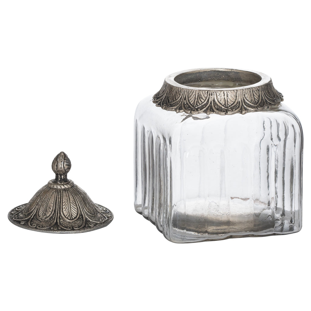 This Moroccan Style Lidded jar has proven to be practical as well as aesthetically pleasing. The patterned metal lid features intricate details and a finial top. Store jewellery inside on a bedside table, culinary creations or bathroom accessories. Larger version available: 21908