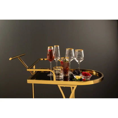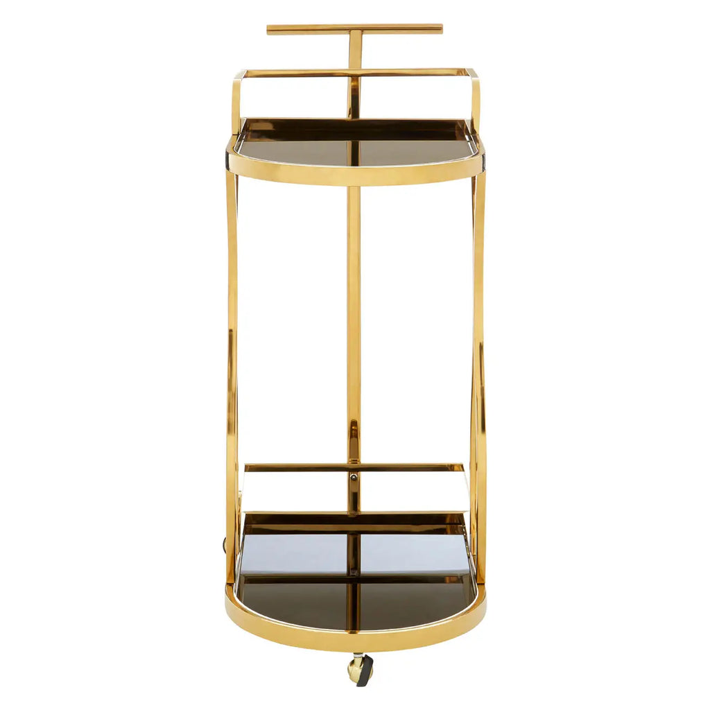 Crafted from strong and resilient stainless steel, the Novo trolley features delicate and refined design elements that form its sophisticated structure. Inspired by the decadent art deco era, the sides of the trolley are adorned with a wavy motif, offering a striking contrast to the straight, T-shaped handle. The two levels within the trolley are constructed with tempered glass and finished in a sleek black, further enhancing its luxurious appeal.