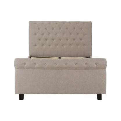 Crafted with luxurious hopsack fabric and boasting a traditional rolled back and footboard, the Orlando light grey ottoman king bed exudes elegance. Its diamond pattern button tufting adds a touch of sophistication and elevates the design to a new level of refinement.