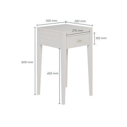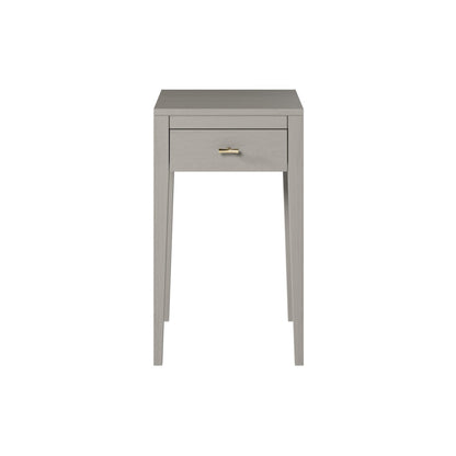 Indulge in the luxurious sophistication of the One Drawer Grey Bedside Table, crafted from solid oak and oak veneer. With a smooth drawer on sturdy metal runners and elegant tapered legs, this piece boasts a visible grain and a brushed brass style bar handle. Elevate your space with this tasteful and exclusive addition to your bedroom décor.