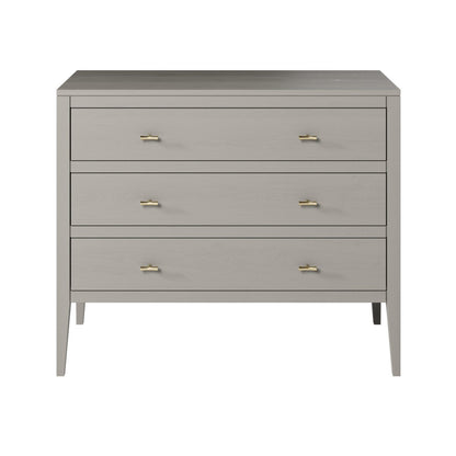 Indulge in the luxurious elegance of the Pablo Chest of Drawers Grey. Solid oak and oak veneer beautifully combine in this three-drawer piece, complete with metal runners and sophisticated tapered legs. The visible grain and brush brass style bar handles add a touch of refinement, making this chest a true work of art.