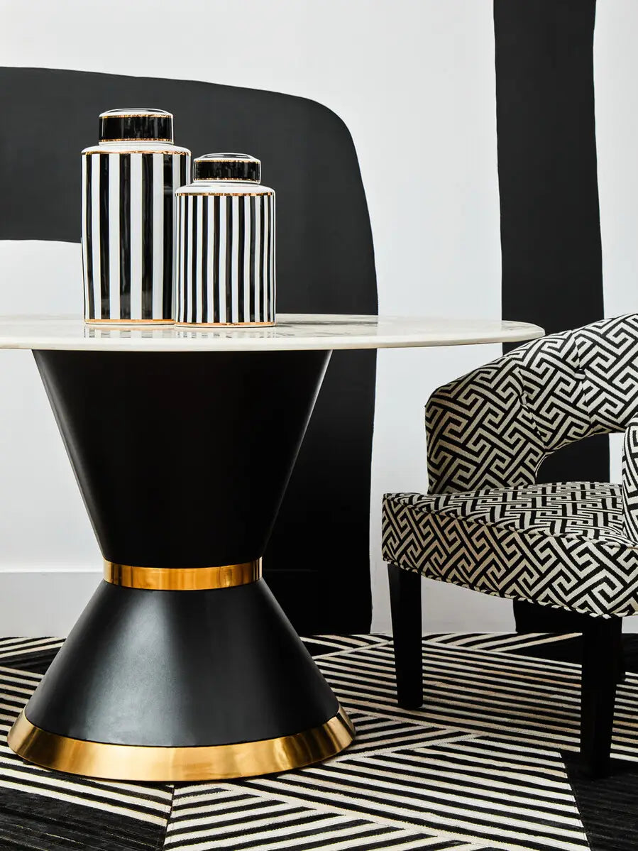 Indulge in the opulent design of our Regents Park Lounge Chair, featuring a stylish cutout back and plush foam padding. The stunning black and white fabric, draped over solid birchwood legs, exudes sophistication. Its eye-catching Greek key pattern and sturdy wooden legs enhance its exquisite appearance.