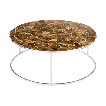 Crafted from sleek stainless steel in a luminous silver coating, the frame exudes a sense of airiness while supporting a lavish round top made of natural agate stone. The stone's characteristic banding displays warm, earthy hues in orange, brown, and ochre, creating a stunning juxtaposition against the cool metallic frame.