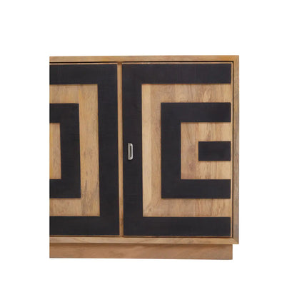 Indulge in the splendor of the Salem 4 Door Sideboard, a modern masterpiece intricately handcrafted from resilient mango wood. Notice the ornate design of alternating black and natural mango wood squares adorning the four spacious doors, spanning the entire width of this luxurious piece.