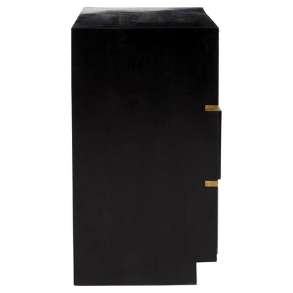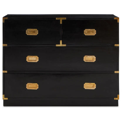 The Sarter black mango wood chest is a decadent addition to you decor. Four large drawers provide ample storage space, while the gold finishings elevate the chest.