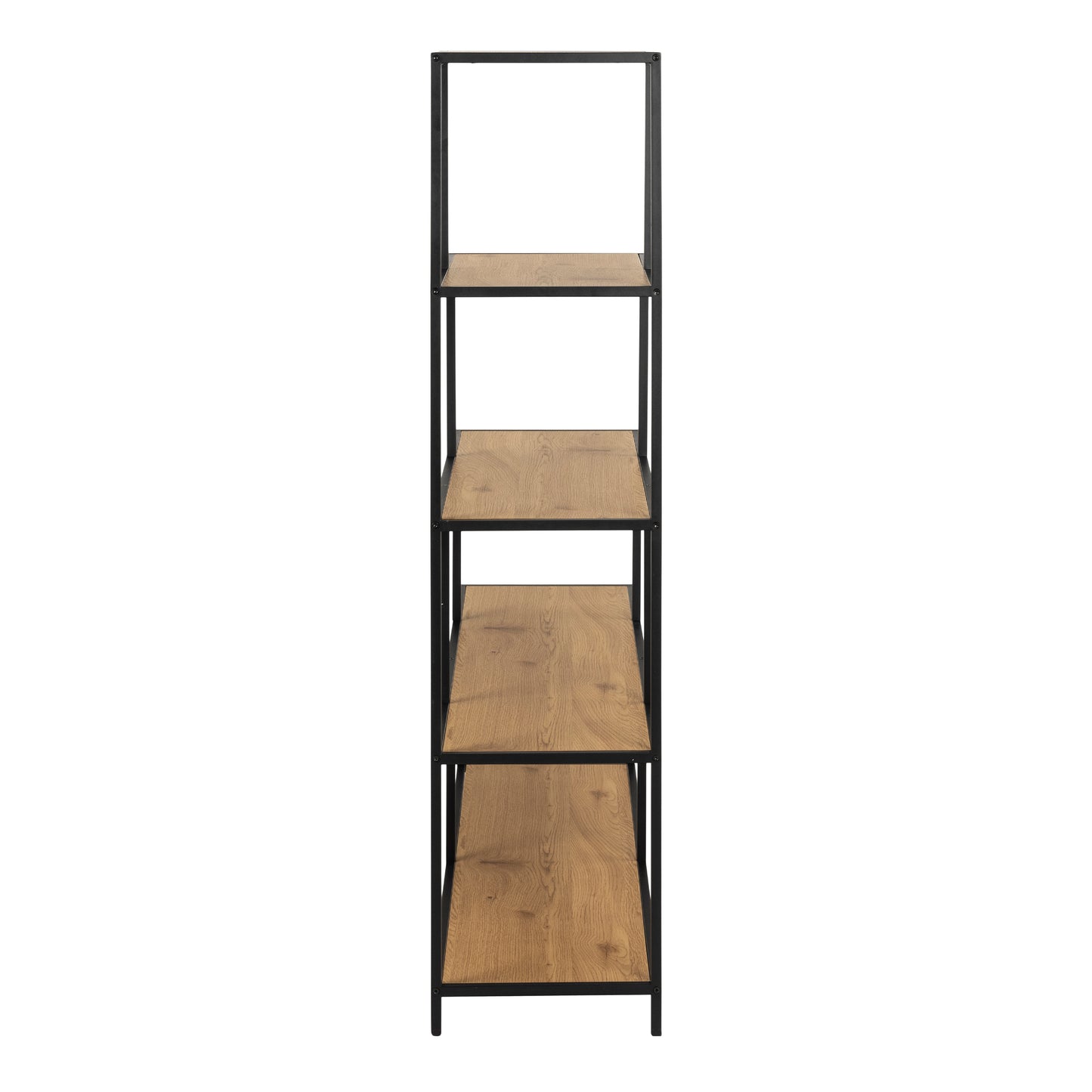 Our bookcase stands out with its matt black steel frame and base, offering four shelves with a matt wild oak effect with an asymmetrical and step-shaped design. It's a modern piece that provides both visual interest and functional storage, ideal for contemporary spaces.