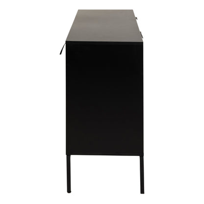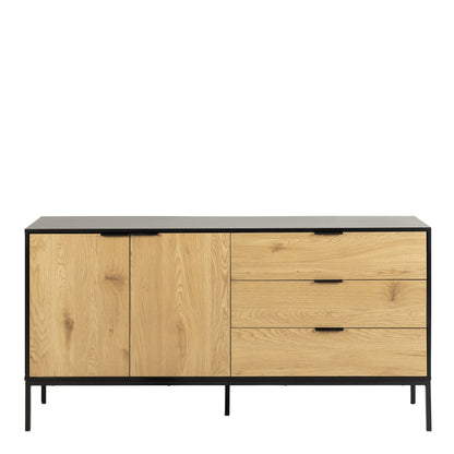 Accentuate your living space with this contemporary sideboard, which features a sleek black painted MDF top and frame. It's equipped with two doors, three drawers, and a shelf with a matte wild oak effect, all set upon a sturdy matte black steel base, offering both style and ample storage.