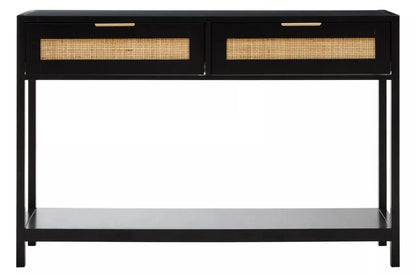 Indulge in the luxurious elegance of our Sherman Black Wood Console Table. Meticulously crafted from premium wood and finished with a sleek black paint, this table exudes sophistication. The front drawers are adorned with natural rattan panels, adding a warm and earthy touch to its design. Plus, with the convenient undershelf, you can add extra storage space to elevate your home decor to a whole new level of style and functionality.