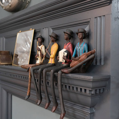 A sitting jazz man, playing the saxophone. Part of the 'Sitting Jazz Band' collection. He has a plat surface, with one hanging leg so it can sit on the edge of a surface.