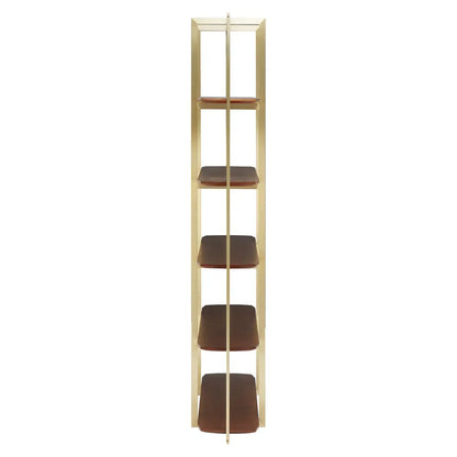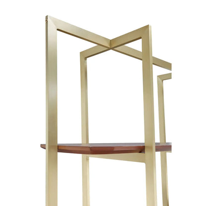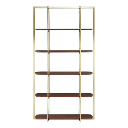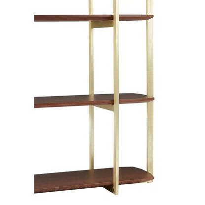 The structure is understated in its design, with an extension above the upper shelf to add a touch of dramatic architecture. The frame boasts a luxurious golden finish that perfectly complements the opulent walnut wood. Ideal for showcasing literary treasures and fine art.