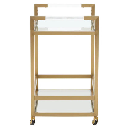 Experience the bold art deco influence of the Vogue two tier butler trolley, where striking geometric elements are perfectly balanced by the combination of luxurious materials. Crafted with a sophisticated matte gold stainless steel frame and complemented by two sleek acrylic handles, the trolley boasts a seamless harmony between form and function.