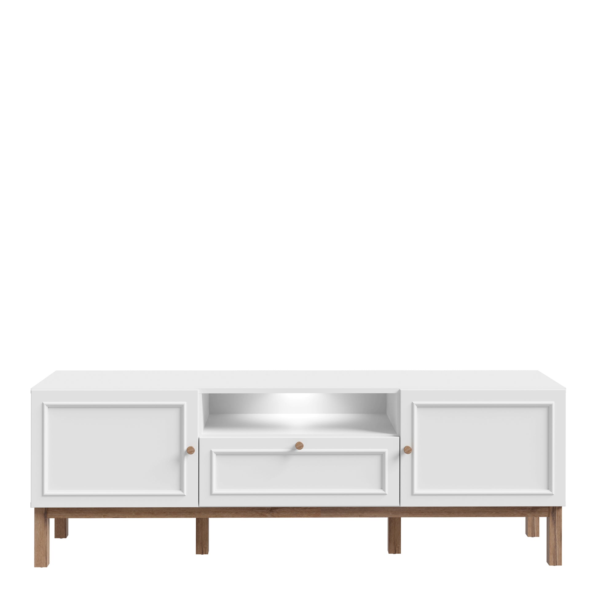 Elevate your living room with the Wensley 2 Door 1 Drawer TV Unit in Light Grey and Oak. Modern design, full-extension drawer slides, optional LED lighting, and chic wooden knob handles. LED lighting included for extra style