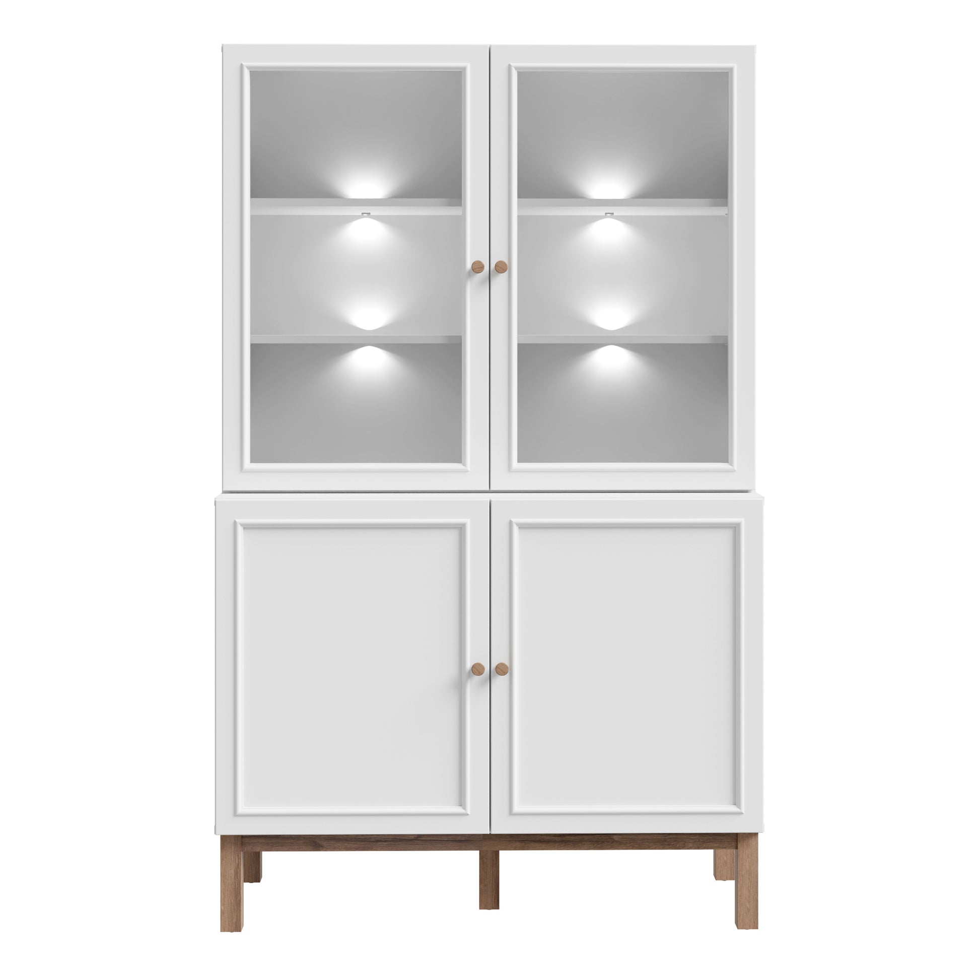 Showcase your treasures with the Wensley Display Cabinet in Light Grey and Oak. Modern design, LED lighting, soft-closing system, and elegant wooden knob handles.