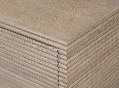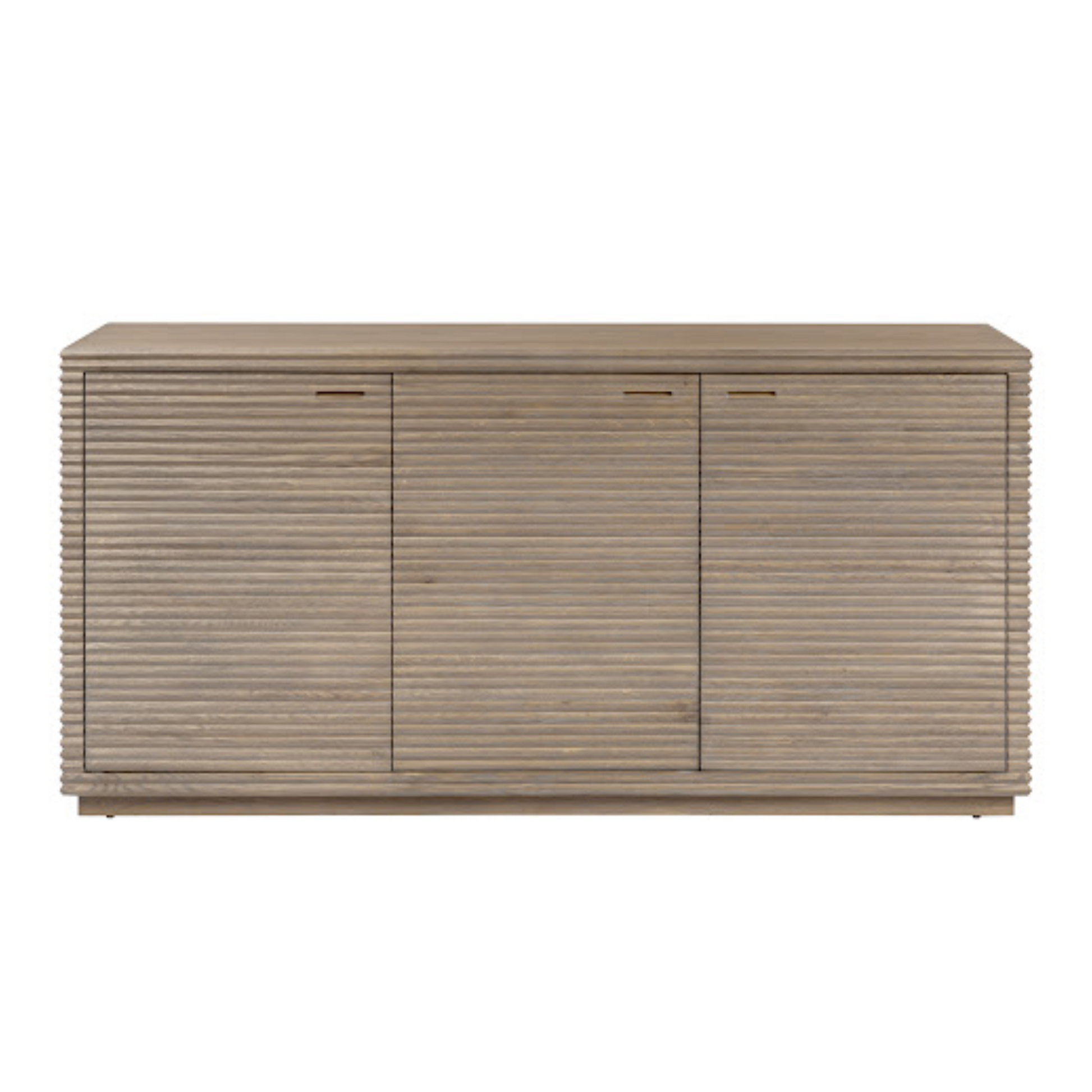 Experience a sense of elegance and exclusivity with our Oakham Ribbed Oak Sideboard. Crafted from premium oak and oak veneer, this sideboard features ribbed front and side panels for a sophisticated touch. Three doors and included shelves provide ample storage space for your belongings.